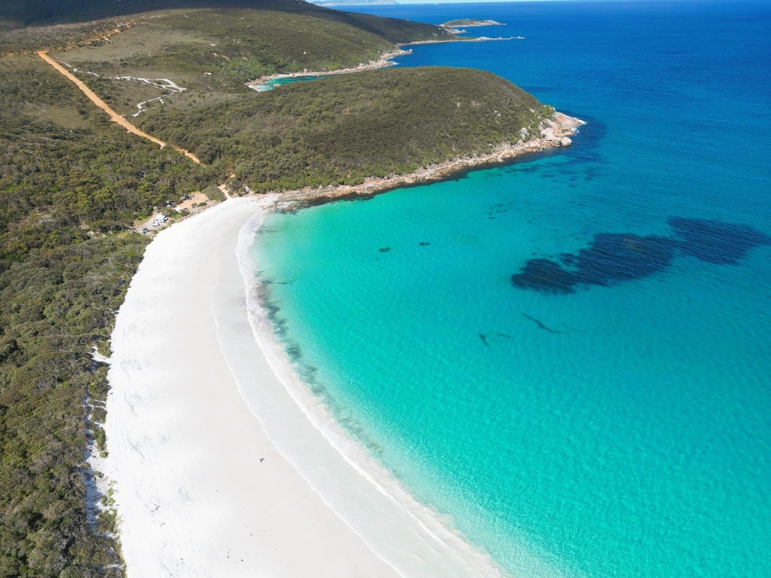Für uns schöner als in der Raffaello-Werbung: weißer Pudersand, türkisblaues Wasser und kaum Menschen. Die geschützte Bucht ist ideal zum Baden und Sonnen: ruhig, abgelegen und paradiesisch. Für uns zählt dieser Ort definitiv zu den schönten Stränden in Westaustralien.
