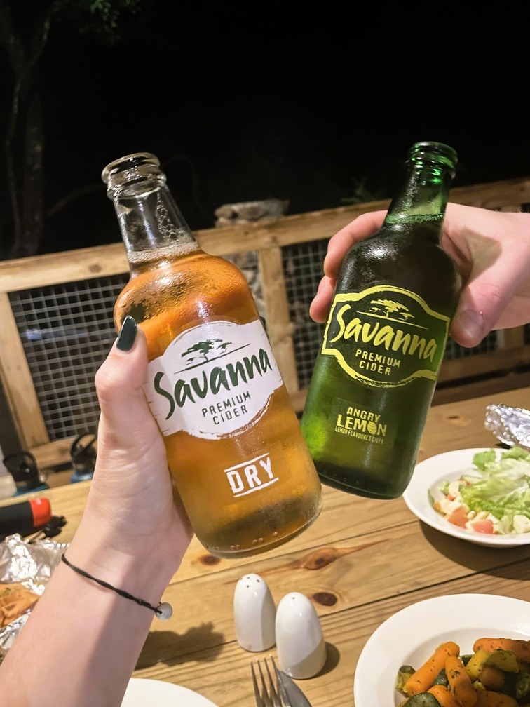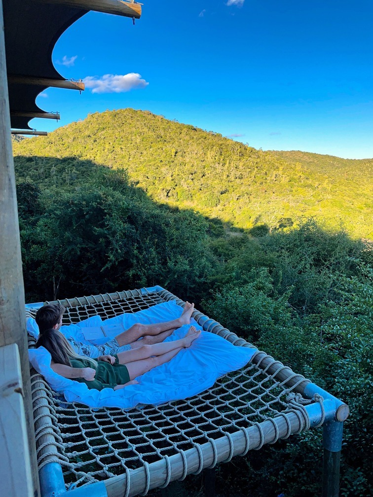Zurück in der Unterkunft genossen wir den Nachmittag in der „Hängematte“ mit Blick in die Natur und es wurde unser bestellter Braai-Korb geliefert (mit vegetarischen Optionen). Dazu gab es neues Feuerholz für den Hot Tub. Perfekt für einen gemütlichen und feierlichen Abend.