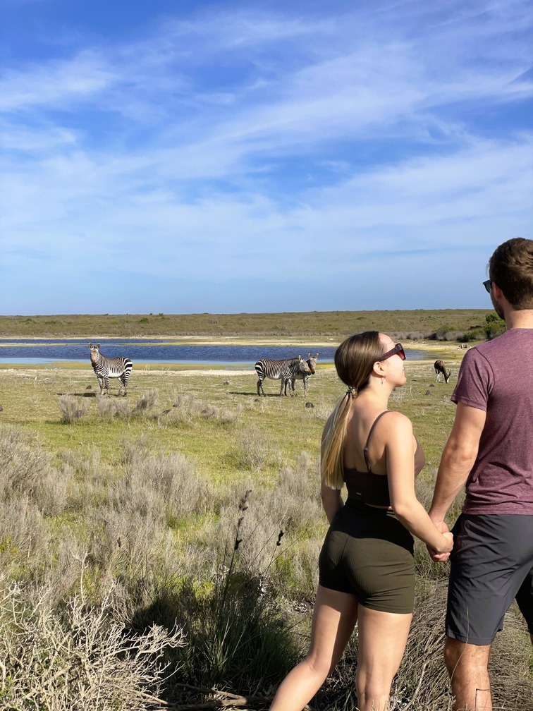 Auf dem Weg dorthin entdeckten wir plötzlich ein paar Zebras an einem kleinen Teich – ganz friedlich und ohne ein weiteres Auto weit und breit. So ein magischer Moment: nur wir zwei und die Zebras.