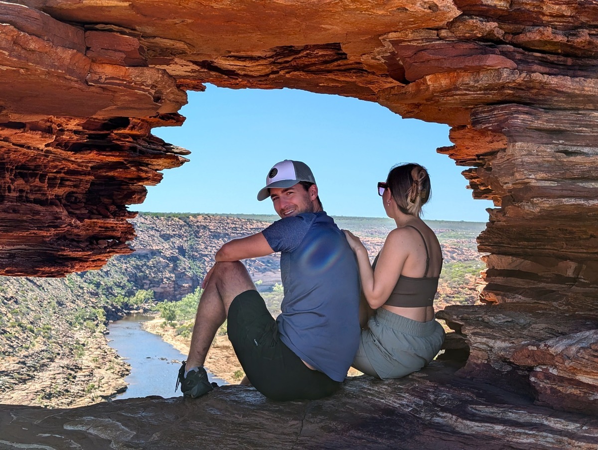 Unser erster Stopp am frühen Morgen war das bekannte Nature’s Window. Das frühe Aufstehen hat sich gelohnt: Wir teilten uns den spektakulären Blick auf die Schlucht und den Murchison River nur mit zwei weiteren Pärchen. Der Weg vom Parkplatz ist sehr kurz und das Felsfenster ist nicht zu übersehen.