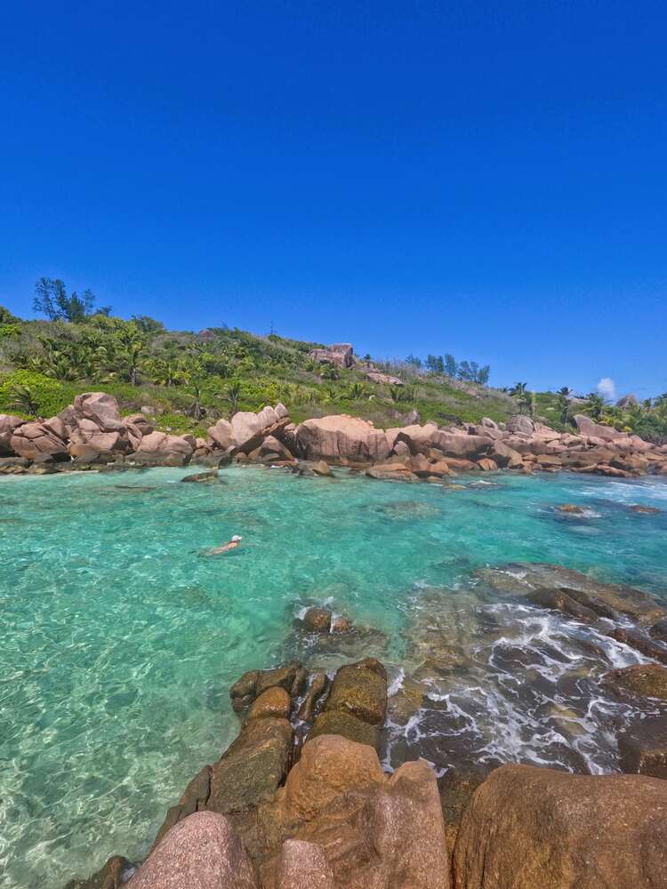 Die markanten Granitfelsen, das seichte, türkisblaue Wasser und die vielen Korallen machen diesen Ort zu einem echten Paradies.