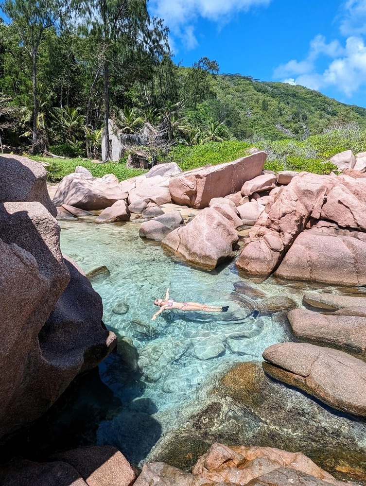 Falls du nicht aus Richtung Anse Marron kommst, kannst du auch vom Anse Source D’Argent aus, zum Anse Pierrot wandern: Bei Ebbe kannst du entlang der Felsen im Wasser dorthin laufen (ca. 300-400 Meter). Achte darauf, Wasserschuhe zu tragen, da es hier Steinfische, Korallen oder Rochen geben kann. Und vergiss nicht deinen Drybag!