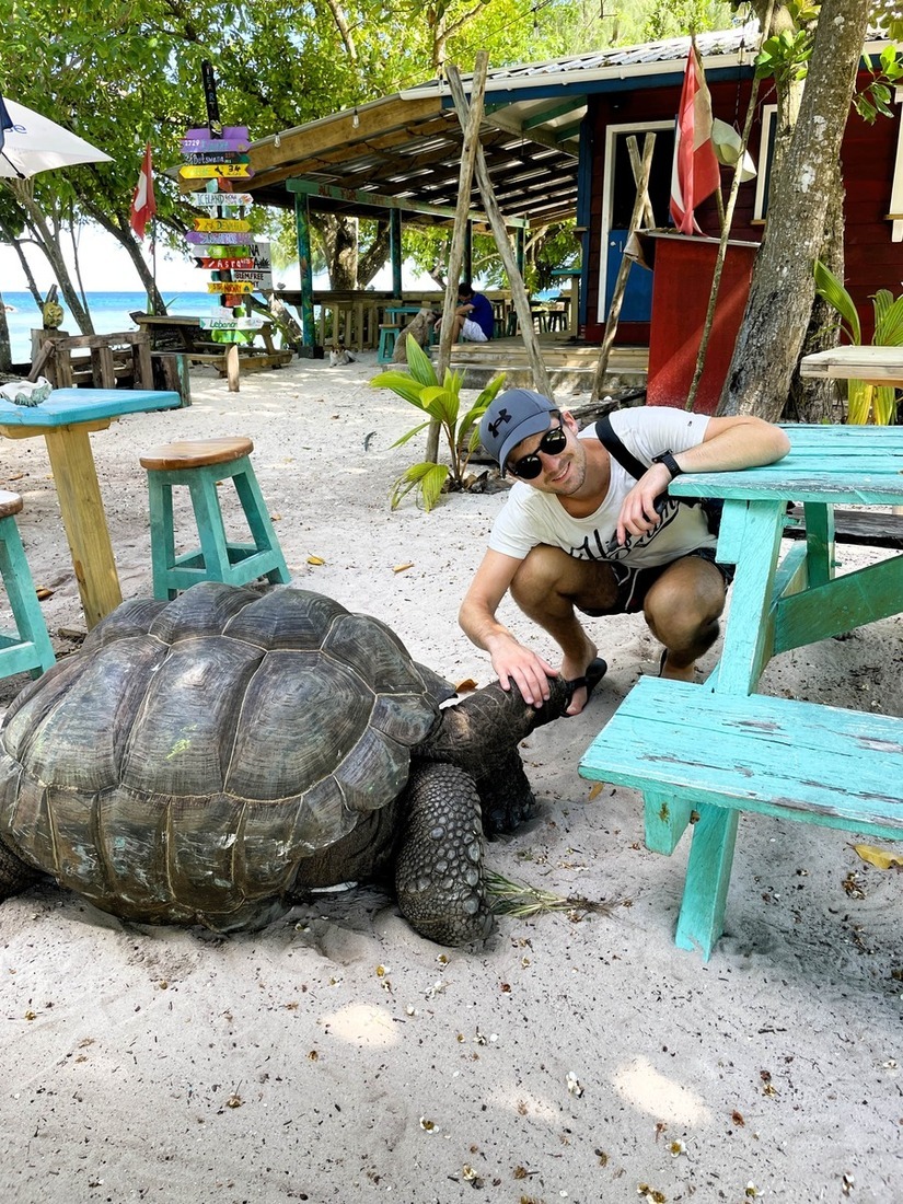 Der Strand liegt im L’Union Estate Nationalpark, der Eintritt kostet 8 Euro pro Person (Stand 2025). Im Park selbst kannst du einiges entdecken: Kokos- und Vanilleplantagen, den gigantischen Giant Union Rock sowie Riesenschildkröten (leider in einem etwas zu kleinen Gehege untergebracht). Wir haben am Strand bzw. im L’Union Estate Nationalpark fast den ganzen Tag verbracht.