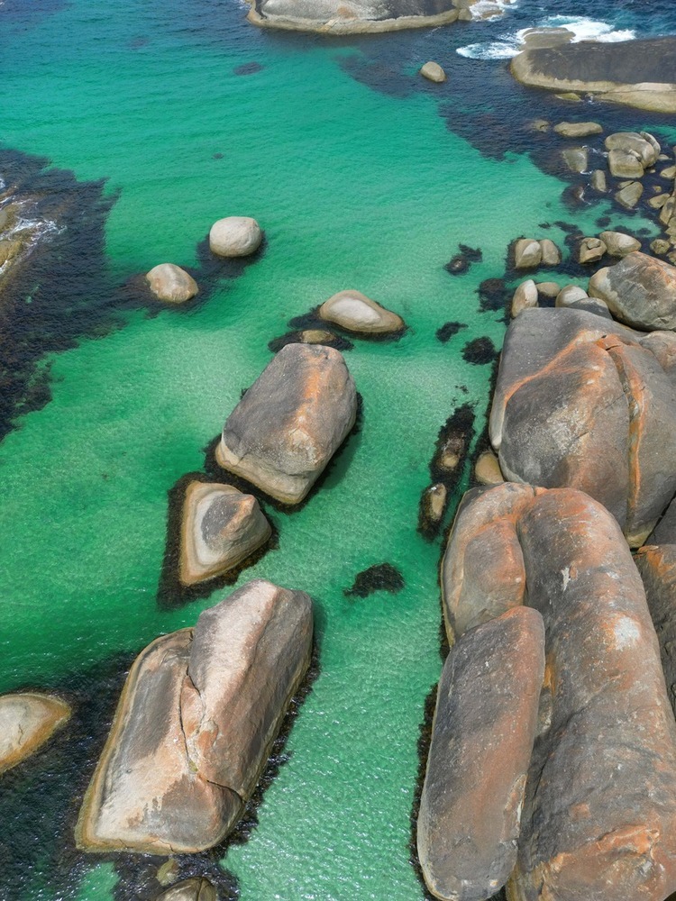 Unser erster Stopp war der Waterfall Beach, ein kleiner, ruhiger Strand, an dem ein kleiner Wasserfall direkt ins Meer mündet. Danach ging es weiter zu den berühmten Elephant Rocks. Die riesigen Felsen erinnern tatsächlich ein bisschen an eine Gruppe badender Elefanten – daher auch der Name. Wir kletterten ein wenig über die Felsen, genossen die Sonne und ließen die Drohne steigen.