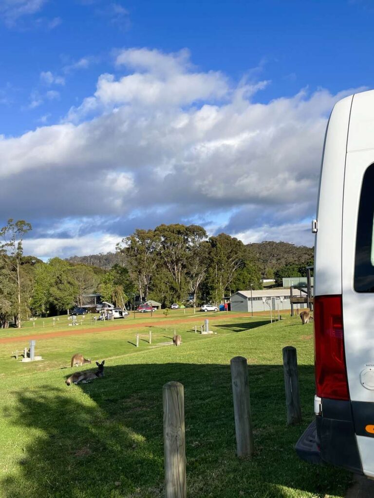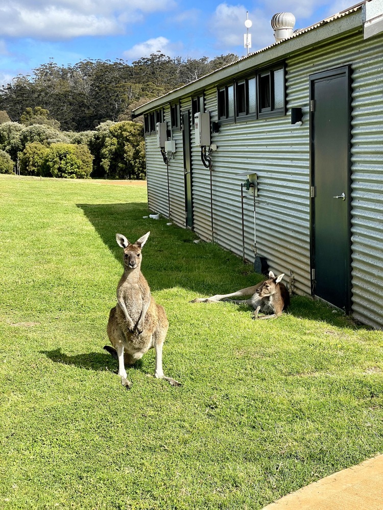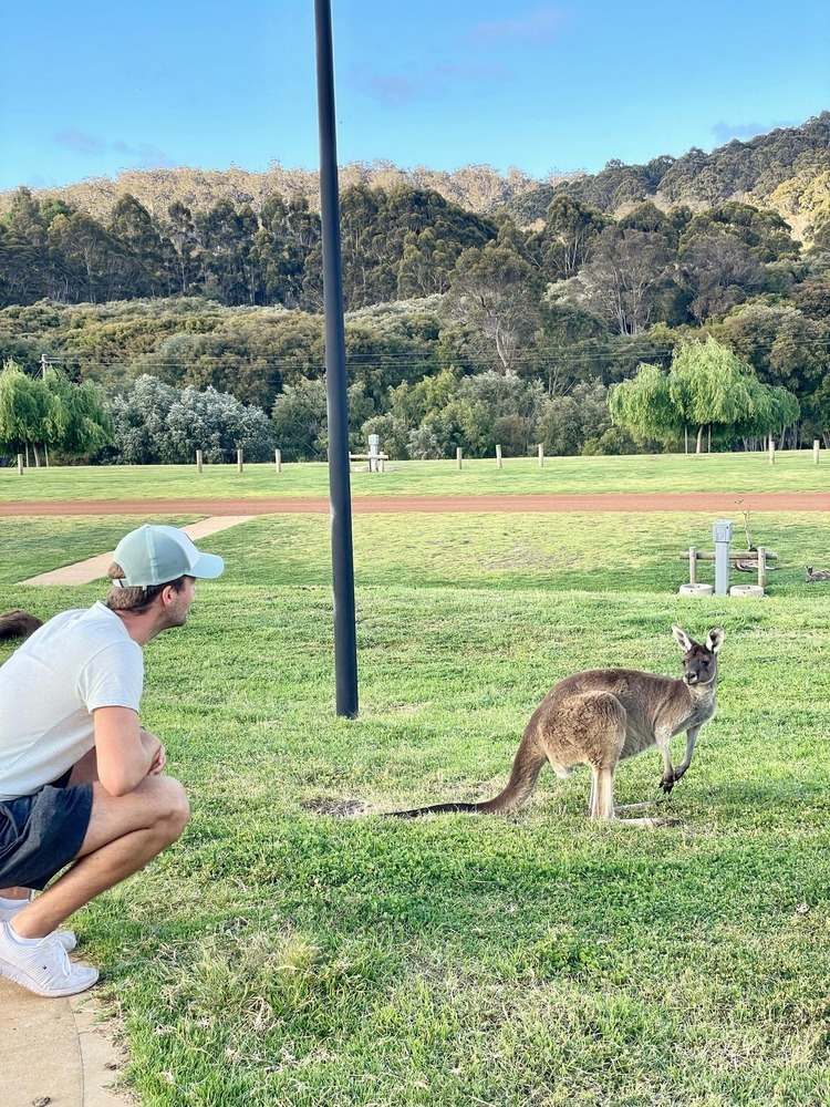 Das Schönste an diesem Platz? Hunderte Kängurus! 🦘 Überall auf dem Campingplatz, bis direkt vor unseren Camper, hüpften sie durch die Gegend und wir konnten sie stundenlang beobachten, ganz in Ruhe. Die große Küche mit Panoramablick auf die Wiese war das i-Tüpfelchen. Unser Abend bestand ausschließlich aus „Kängsis beobachten“ – inklusive ein paar lustigen Boxkämpfen zwischen zwei Kängurus.