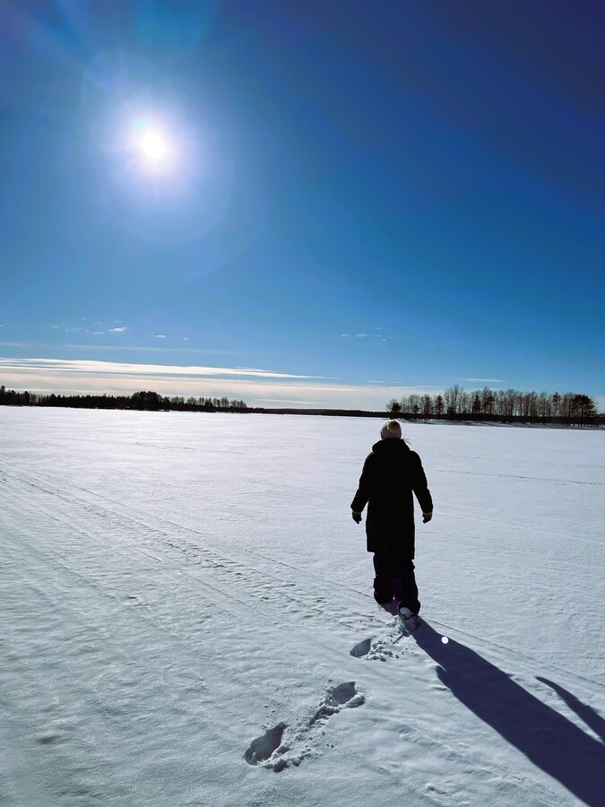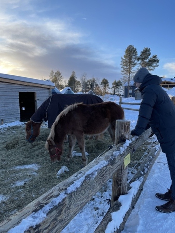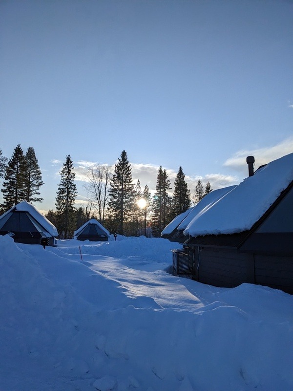 Das Resort liegt an einem riesigen See, der im Winter komplett zugefroren ist. Dort sind wir gerne spazieren gegangen. Rund um das Resort leben auch Rentiere, Pferde und Huskys und es gibt viele Aktivitäten, die du buchen kannst: von Snowmobilfahrten über Eisangeln bis hin zu Huskytouren und Schneeschuhwanderungen.