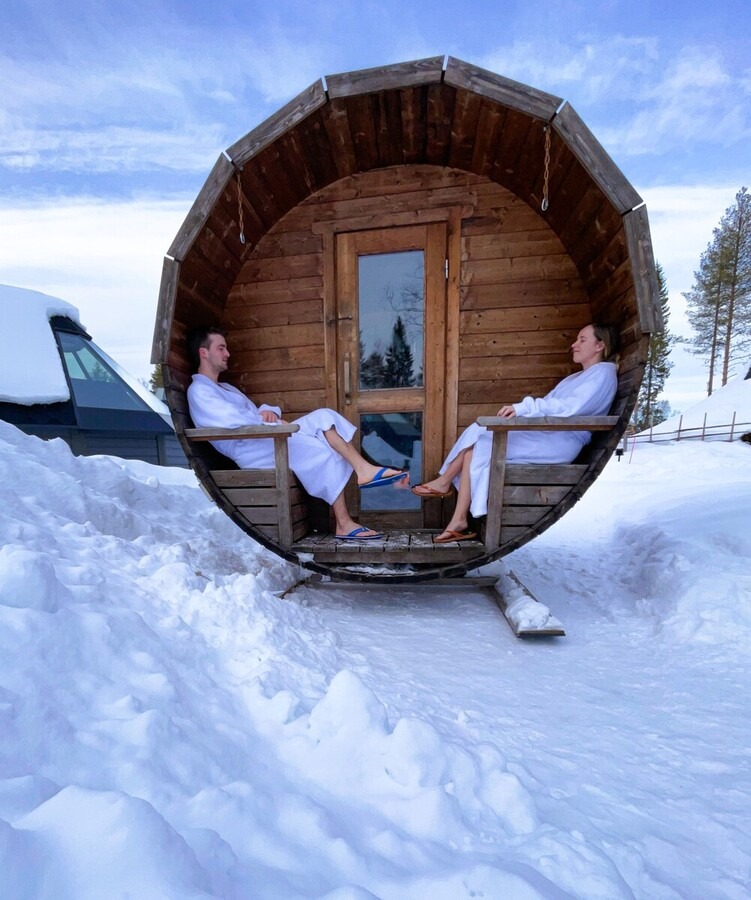 Im Apukka Resort gibt es verschiedene Sauna-Angebote, zum Beispiel kannst du ein Saunafass für 1,5 Stunden mieten, das sogar auf Skiern direkt zu deinem Glasiglu gebracht wird.
