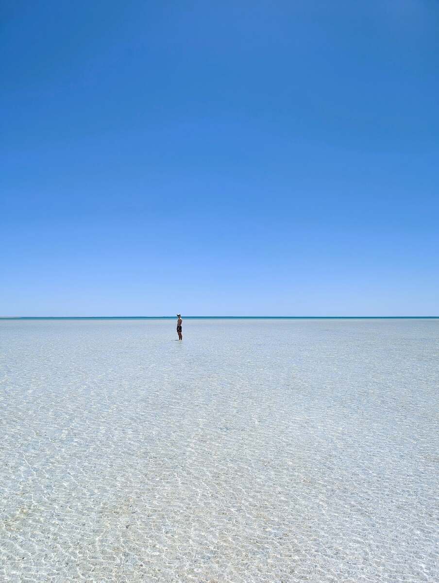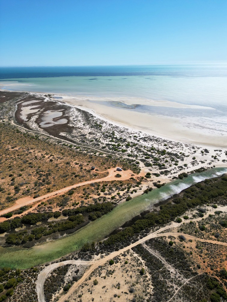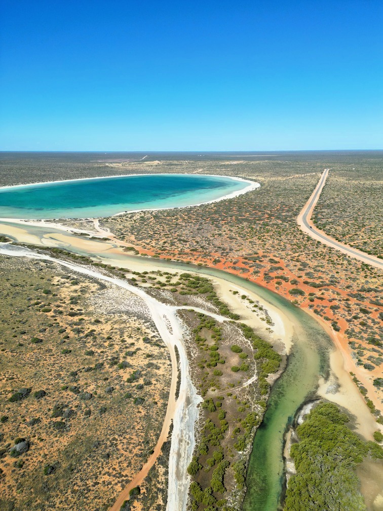 Weiter ging es zur Little Lagoon bei Denham. Ein absolut ruhiger, türkisblauer Ort, ideal für eine kurze Pause. Besonders spektakulär: die Drohnenaufnahmen von hier – traumhaft schön! 📸