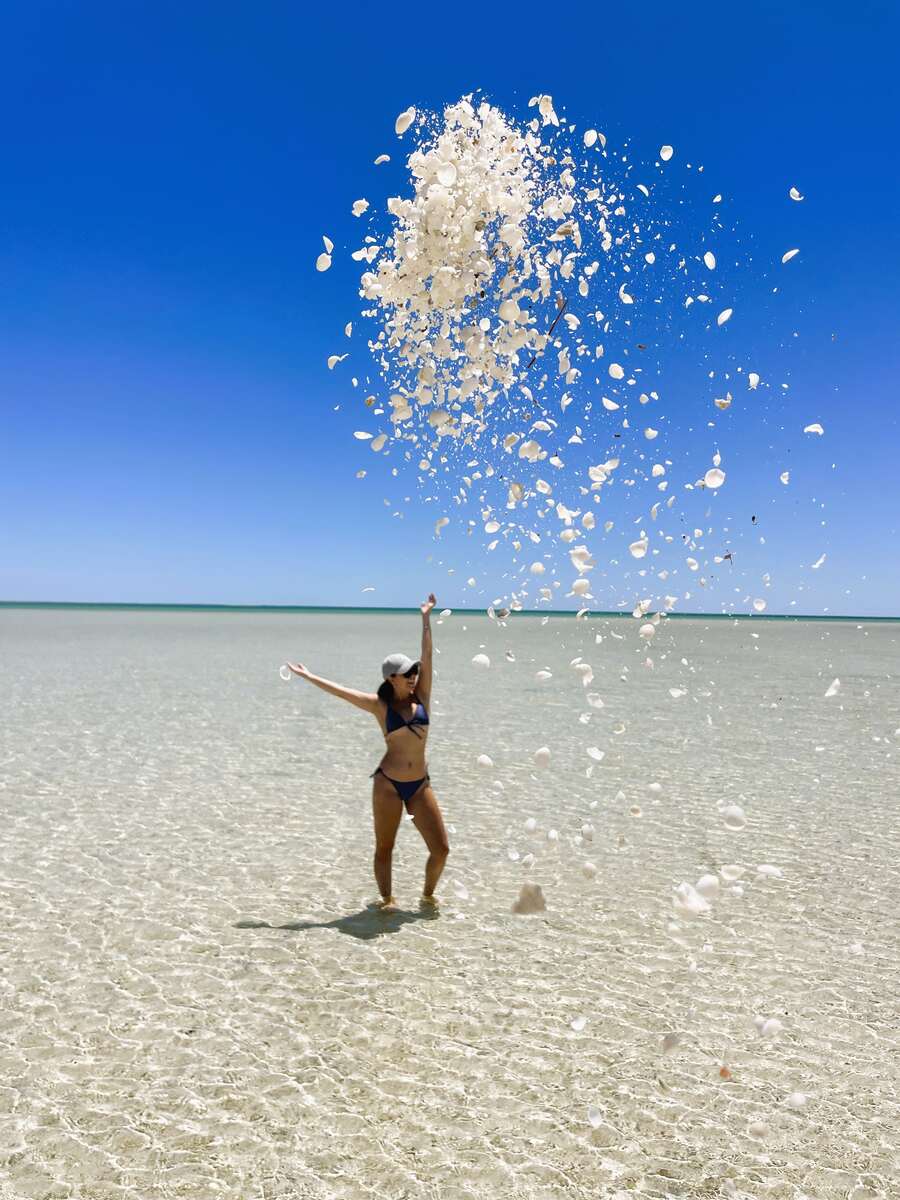 Der nächste Halt war Shell Beach, ein einzigartiger Strand, der komplett aus kleinen weißen Muscheln besteht. Hier ist der Salzgehalt des Wassers doppelt so hoch wie üblich und das merkt man sofort, wenn man ins Meer geht! Wir genossen hier etwas Zeit am Wasser, bevor wir weiter Richtung Denham fuhren.