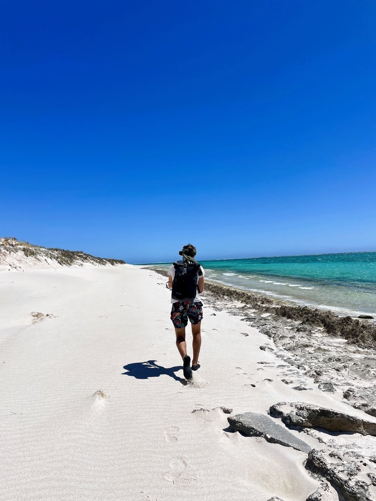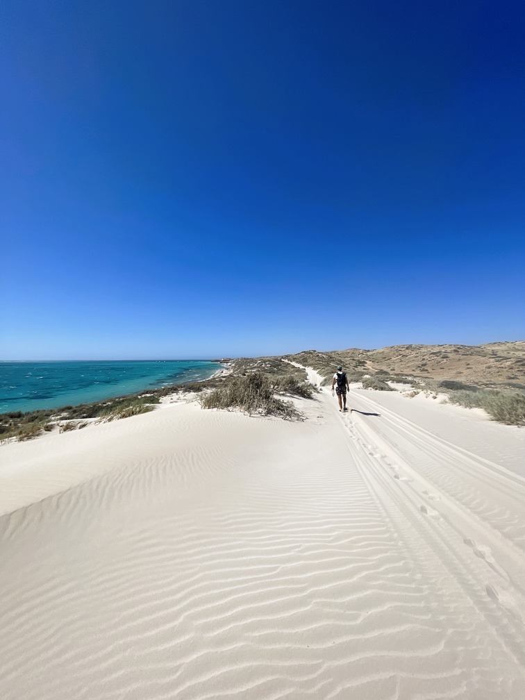 Etwas übermütig machten wir uns danach auf den Weg zum Five Fingers Reef, einem abgelegenen Schnorchelspot südlich von Coral Bay. Der Haken: Die Strecke ist eigentlich nur mit Allradfahrzeug machbar. Da wir kein 4×4 Fahrzeug hatten, starteten wir zu Fuß – bei 35 Grad und praller Sonne. Nach 40 Minuten waren wir zwar am Ziel, mussten aber feststellen, dass Wind und Strömung zu stark für sicheres Schnorcheln waren. Also blieb uns nichts anderes übrig, als den Rückweg anzutreten. Zum Glück nahm uns auf halber Strecke ein Pärchen mit 4×4 mit zurück. Auch wenn wir komplett erledigt waren, die Landschaft dort war atemberaubend.