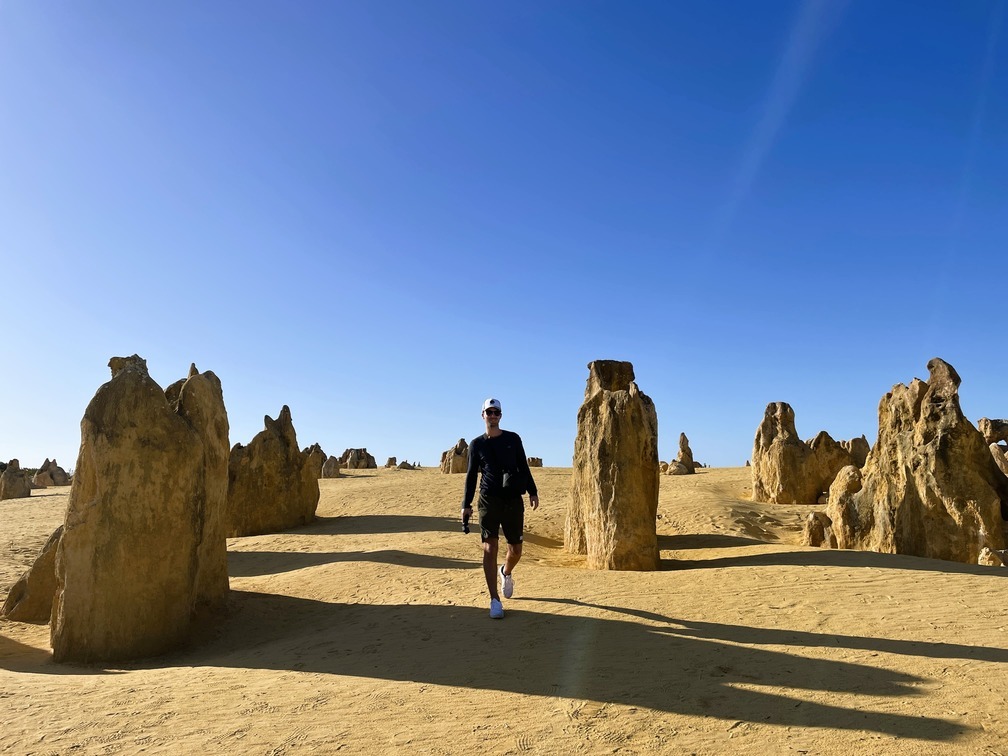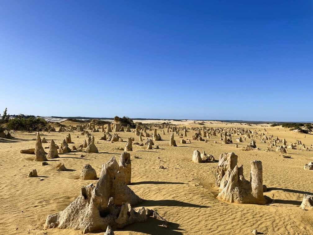 Dann ging’s endlich „on the road“. Unser erster Stopp: der Nambung Nationalpark mit den berühmten Pinnacles – tausende Kalksteinsäulen, die wie aus dem Nichts aus dem gelben Sandboden ragen. Die Landschaft wirkt wie nicht von dieser Welt, absolut sehenswert!